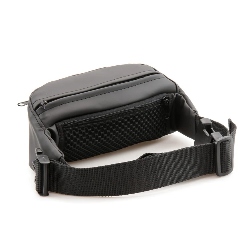 Τσαντάκι μέσης σε RUBBER δερματίνη υψηλής αντοχής με τσέπη εμπρός που χωράει κινητό, κεντρικό χώρο που θα χωρέσει όλα σας τα πολύτιμα αντικείμενα, πίσω τσέπη, με ιμάντα φάρδος 4cm και πλαστικό κούμπωμα υψηλής ασφάλειας με το ανακλαστικό σήμα της εταιρίας εμπρός που εύκολα θα γίνει ο αχώριστος σύντροφος σας σε καθημερινή χρήση. Διαστάσεις: 28cm x 12cm x 12cm.