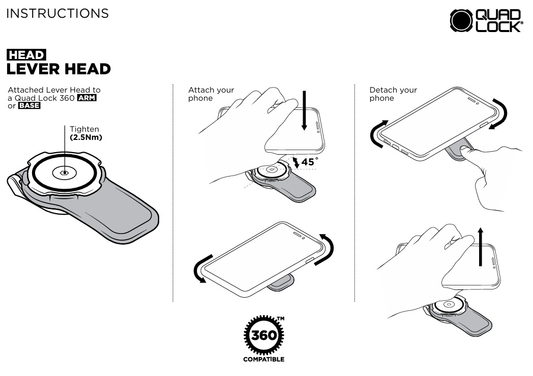 Τα Lever Heads προσαρμόζονται εύκολα σε οποιοδήποτε Quad Lock 360™ ARM ή BASE, επιτρέποντας ρυθμίσεις ανά 10 μοίρες για την ιδανική γωνία θέασης και εργονομία στη χρήση.